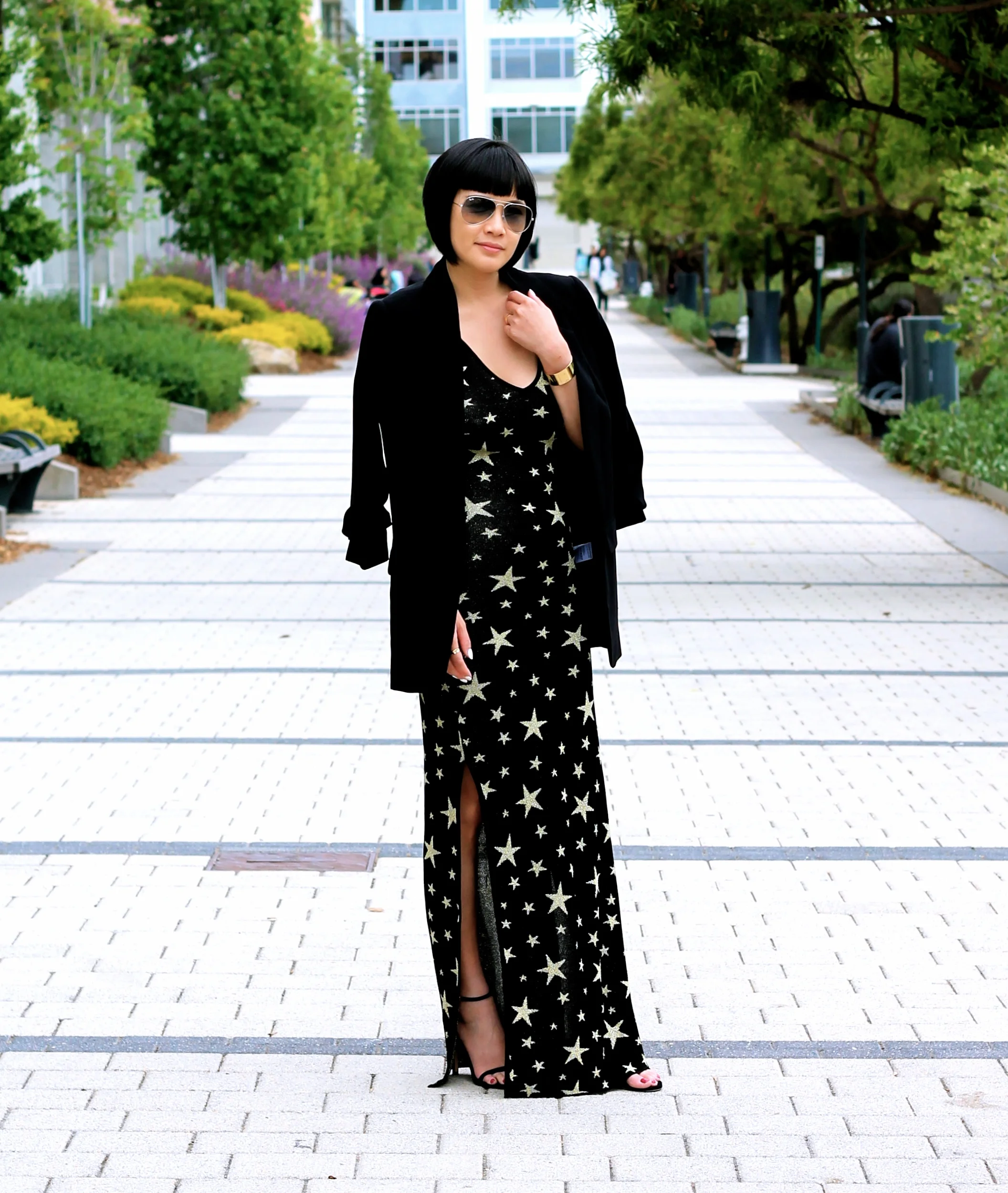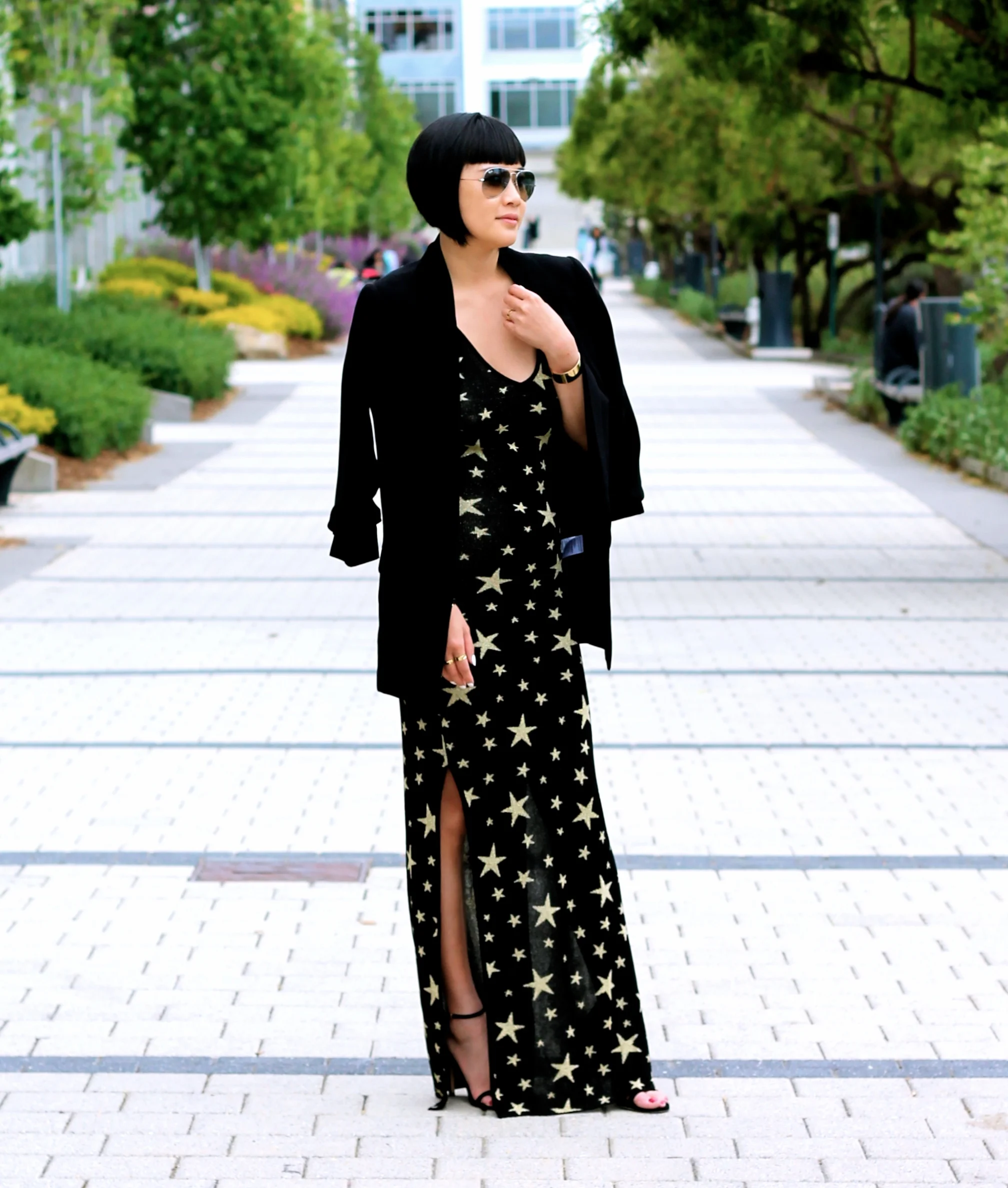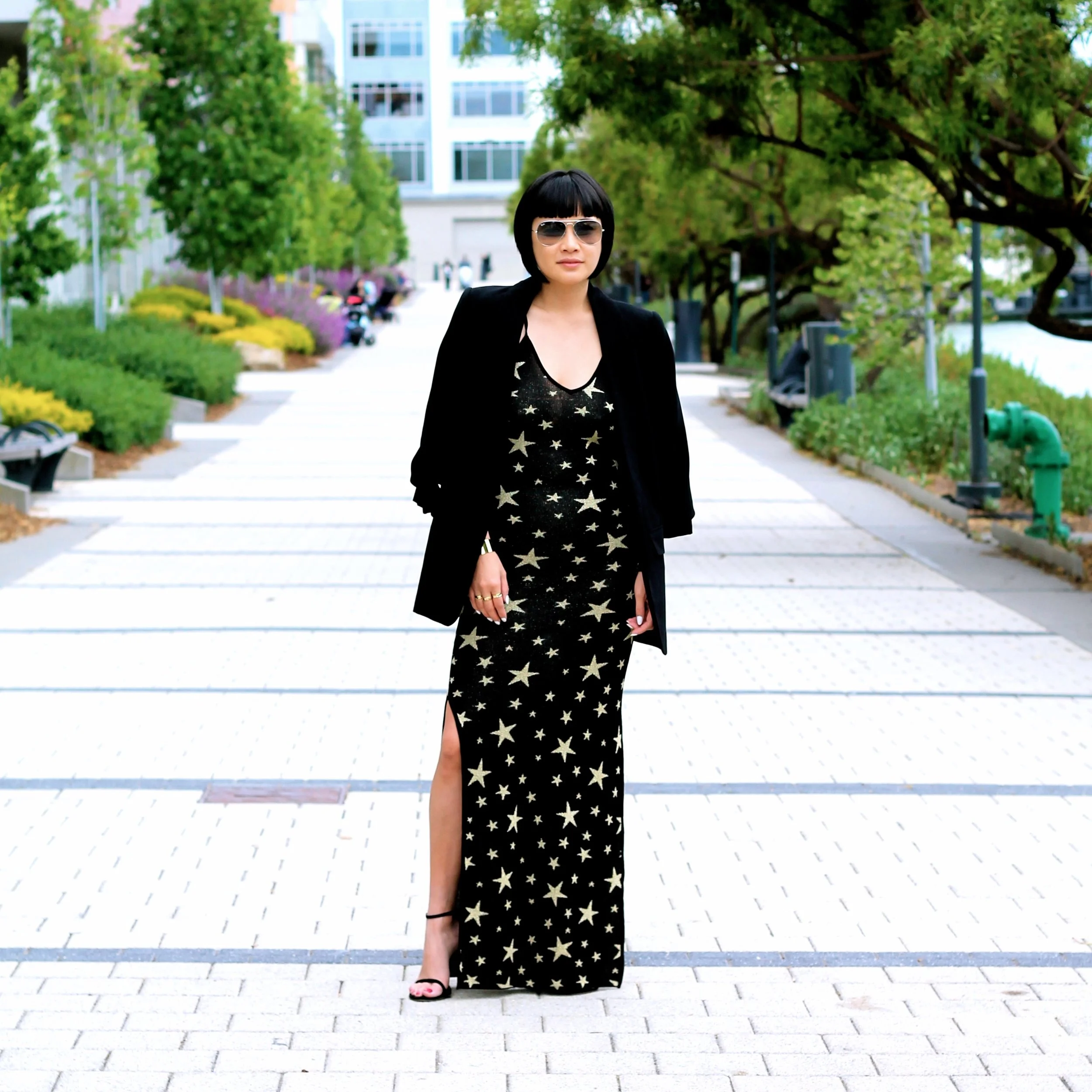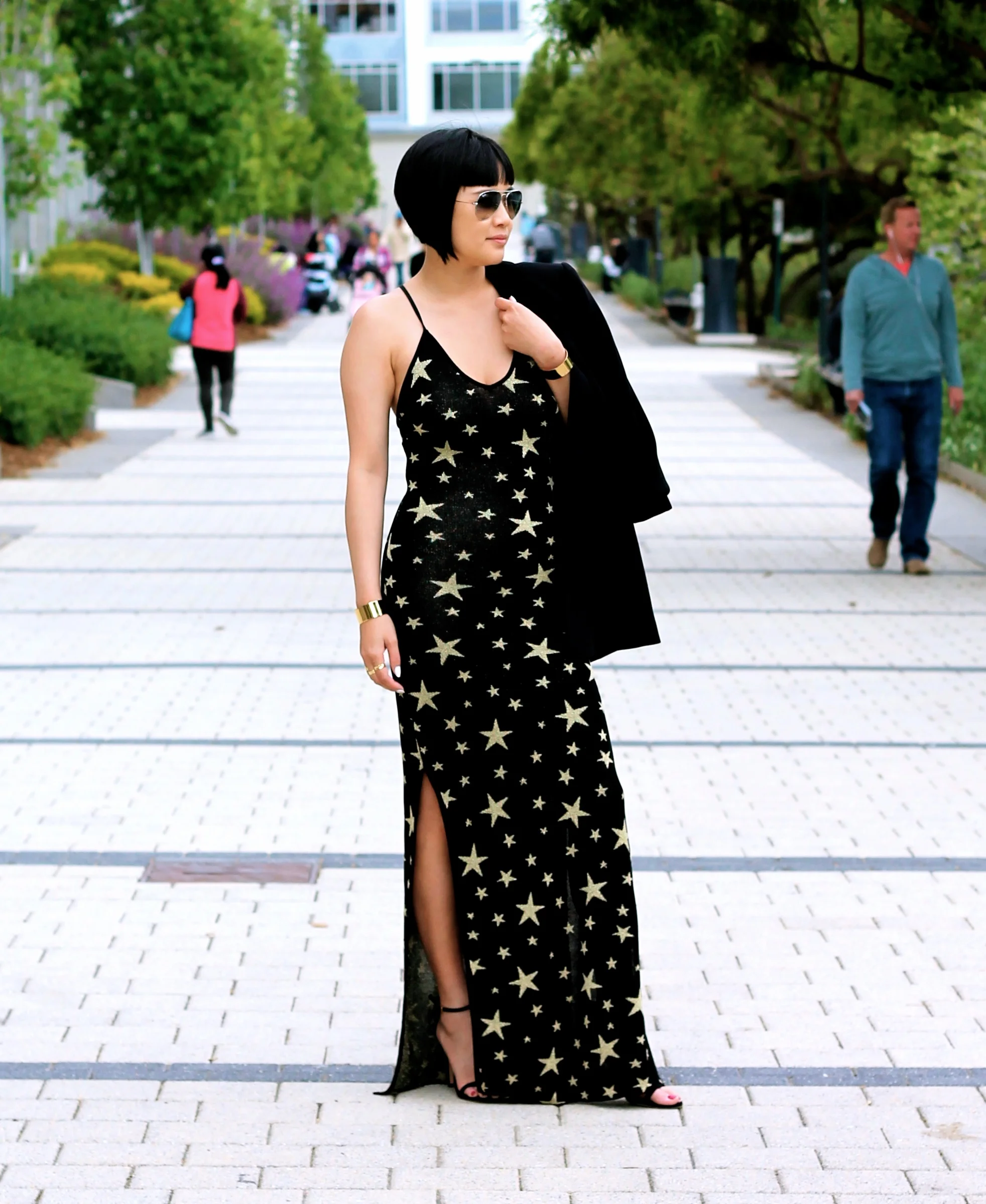 House of Harlow dress, Asos jacket, Stuart Weitzman shoes, Ray-Ban sunglasses, Svelte Metals cuffs